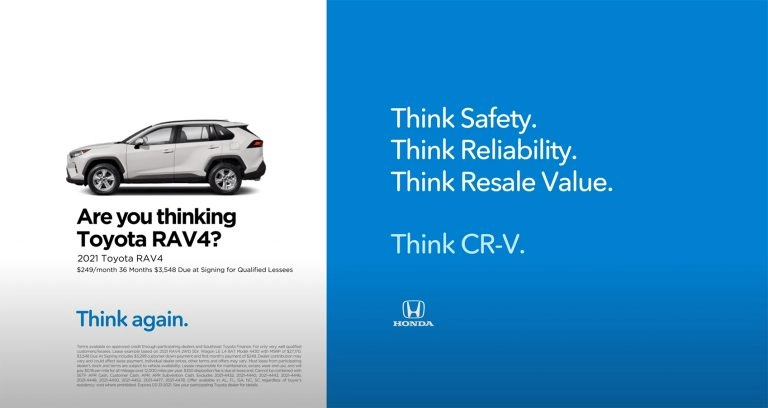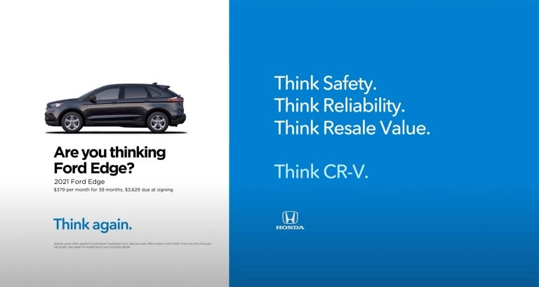 Tier10 created the “Think Honda” pre-roll campaign to amplify its digital remarketing strategy. Using dealer insight, market reports, third-party data providers, and Tier10’s proprietary in-house technology solution, the agency paired each Honda model with comparable competitor vehicles for each of their clients’ markets (e.g., Honda CR-V vs. Toyota RAV4; Honda CR-V vs. Nissan Rogue; Honda CR-V vs. Kia Sportage). The agency then created 15-second pre-roll ads for each pair, serving the ads when a consumer searched for a competing vehicle.
